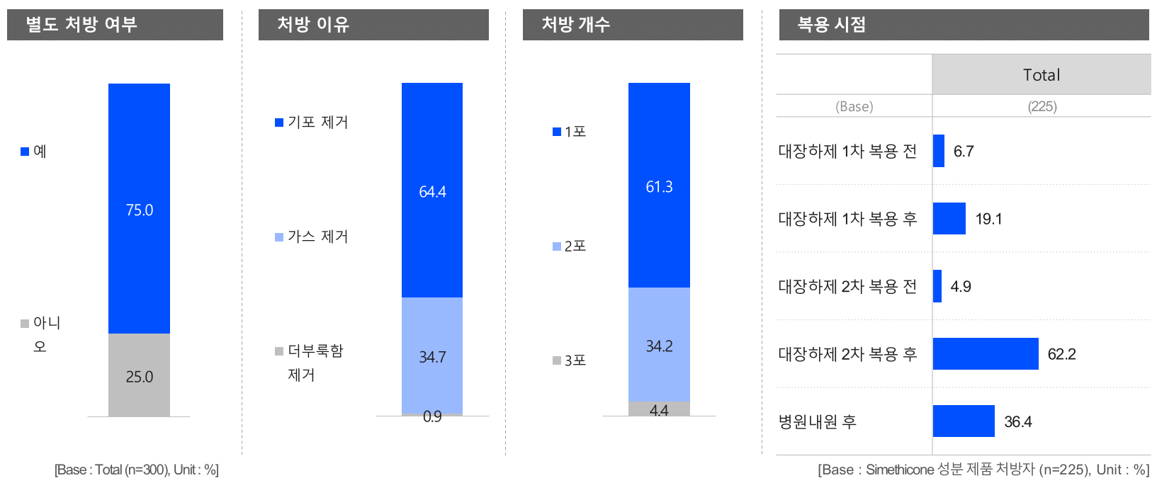 또한 처방 개수는 '1포'가 61.3%이며, 34.2%는 '2포'를 처방했으며, 복용 시점은 '대장하제 2차 복용 후'가 62.2%로 가장 높은 비율이며, 36.4%는 '병원 내원 후'였다.