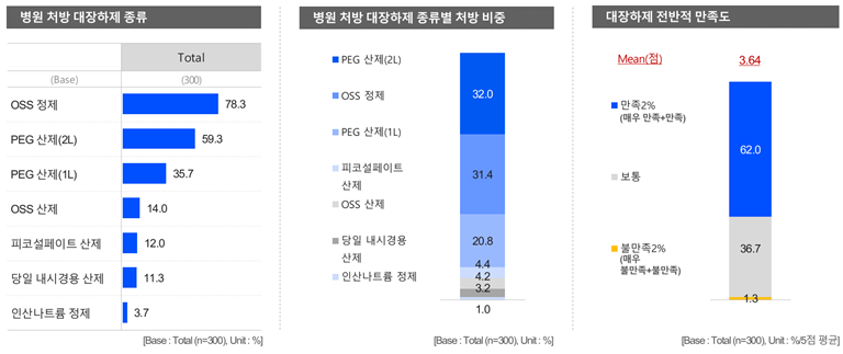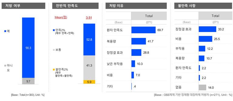 OSS제제 기반 정제형 대장하제 처방률은 90.3%로 높은 비율이었으나, 전반적 만족률은 52.8%로 크게 높지 않았다.