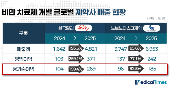 지난해 가장 화려한 성적표를 거둔 곳은 단연 한국릴리와 노보노디스크제약이다. 특히 이 두 기업은 매출 성장세는 비슷해 보이지만, '순이익' 지표에서 전략적 차이가 확연히 드러났다.