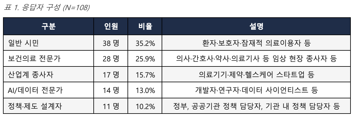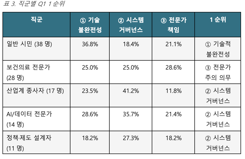 AI·데이터 전문가(개발자·연구자·데이터 사이언티스트)에서 알고리즘 투명성 공개 요구(④)를 선택한 비율은 25.0%로 다른 직군의 두 배 수준이었다. 시스템 개발 및 구축에 관여하는 이들은 개인 책임 추궁보다 알고리즘의 임상검증 이력과 안전성 평가 자료의 공개를 먼저 요구하는 경향이 있다.