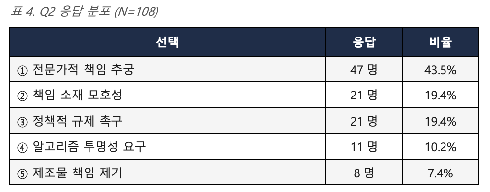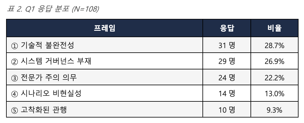 이 질문은 응답자가 사고의 원인을 어디에 귀속시키는지를 측정하기 위해 설계했다. 원인 귀속이 거버넌스 설계에서 중요한 이유는, 그것이 대응 방향의 출발점을 결정하기 때문이다. ①을 선택하면 기술 성능 개선이 대응 방향이 되고, ②를 선택하면 제도 설계가, ③을 선택하면 임상 프로세스 재설계가 대응 방향이 된다.