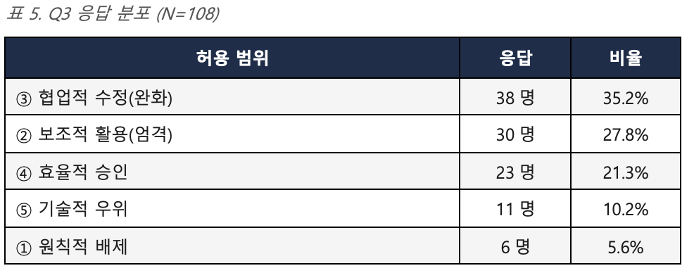 Q4에서 정책·제도 설계자는 법적 책임 입증 법제화(36.4%)를 1순위로 꼽은 반면, 보건의료 전문가는 AI 리터러시 교육(37.5%)을 1순위로 선택했다. 법을 통해 허용 범위를 정하려는 집단과, 현장 역량을 먼저 강화해야 한다는 집단의 방향이 다르다. 이 차이가 소규모 표본의 한계를 넘어 구조적 패턴인지는 더 큰 규모의 조사가 필요하다. 다만 규범을 설계하는 위치에 있는 집단과 그것을 이행하는 위치에 있는 집단이 동일한 질문에 다르게 응답하는 방향성 자체는, 향후 거버넌스 설계 과정에서 직군 간 의견 수렴이 필요하다는 점을 시사한다.