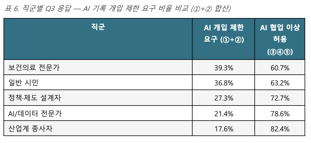 Q3에서 전체 응답자의 33.3%는 "AI가 진료 기록에 개입해서는 안 되거나, 의사가 AI 초안을 참고하더라도 처음부터 새로 작성해야 한다"고 답했다. 직군별로 보면 보건의료 전문가(39.3%)와 일반 시민(36.8%)에서 이 응답 비율이 상대적으로 높았고, 산업계 종사자(17.6%)와 AI·데이터 전문가(21.4%)에서는 낮았다. 정책·제도 설계자(N=11)는 54.5%가 "AI 초안을 의사가 검토·수정하면 충분하다"고 답했으나, 이 집단의 표본이 11명에 불과해 비율 수치를 직접 비교하는 데는 주의가 필요하다.