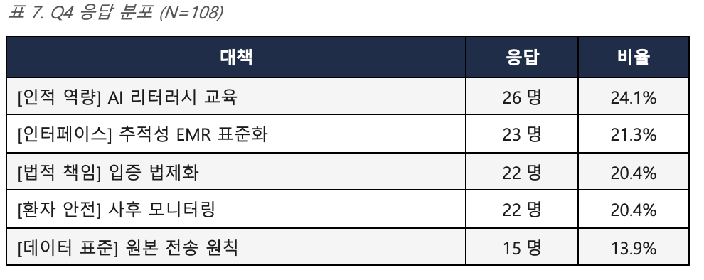 Q4. '기록의 세탁'으로 인한 사고를 방지하고 기술 신뢰도를 확보하기 위해, 도입이 가장 시급한 대책은 무엇이라고 보십니까? [인적 역량] 의료진 AI 리터러시 교육 의무화: AI 요약의 한계와 맥락 소거의 위험성을 인지하고, 생성물에 대한 비판적 검토 능력을 기르는 교육을 임상 필수 과정으로 지정한다 [인터페이스] 출처 표기 및 추적성(Traceability) EMR 표준화: AI 생성 기록의 근거가 된 원본 데이터를 즉시 확인할 수 있는 기능을 EMR 표준으로 탑재한다 [법적 책임] 책임 분담 및 입증 책임 법제화: AI 기록을 승인한 의사의 주의 의무 한계를 규정하고, 알고리즘 결함에 대한 제조사 책임을 명시하여 법적 불확실성을 해소한다 [환자 안전] AI 기록 사후 모니터링 시스템: AI 생성물로 인한 오류가 보고될 경우 해당 알고리즘을 즉시 격리·재검증하는 Post-market Surveillance 체계를 가동한다 [데이터 표준] 전원 시 원본 데이터 전송 원칙: 병원 간 전송 시 요약본이 아닌 원천 기록 전체를 공유하도록 시스템을 규격화한다 |