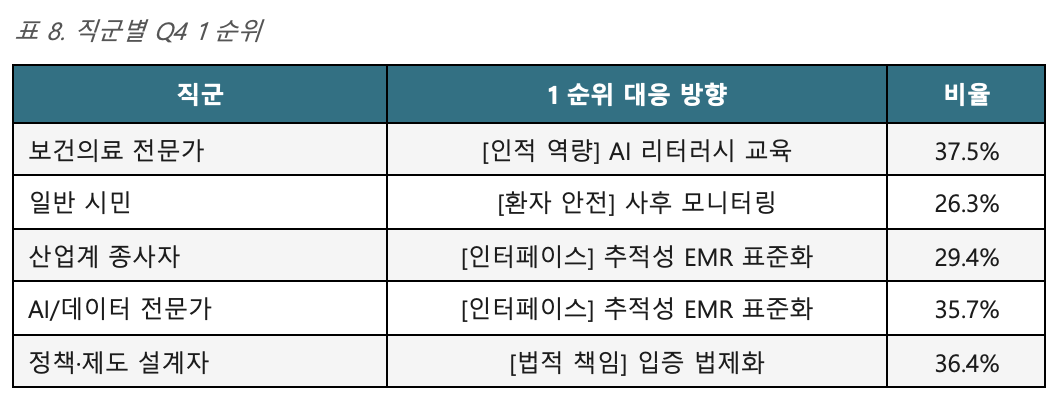 다섯 집단이 모두 다른 대응 방향을 1순위로 선택했다. 임상 현장에서 직접 기록을 다루는 보건의료 전문가는 역량 강화를, 오류의 최종 수신자인 일반 시민은 사후 안전망을, 시스템 구축에 관여하는 산업계 종사자와 AI·데이터 전문가는 기술적 설계 변경을, 규범 제정의 위치에 있는 정책·제도 설계자는 법적 책임 구조를 선택했다.