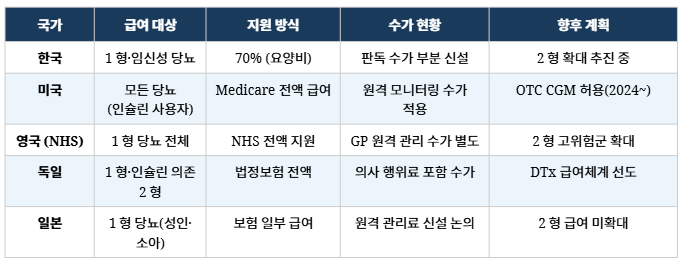영국 NHS는 1형 당뇨병 환자 전체에게 CGM을 무상 제공하며 2형 고위험군으로의 확대를 추진 중이고 독일은 법정 의료보험을 통해 인슐린 의존 2형 환자에게도 전액 급여 지원뿐 아니라 디지털 치료기기(DTx)에 대한 별도 보험 등재 체계(DiGA)를 세계 최초로 도입해 디지털 헬스케어 수가 체계를 선도하고 있다.