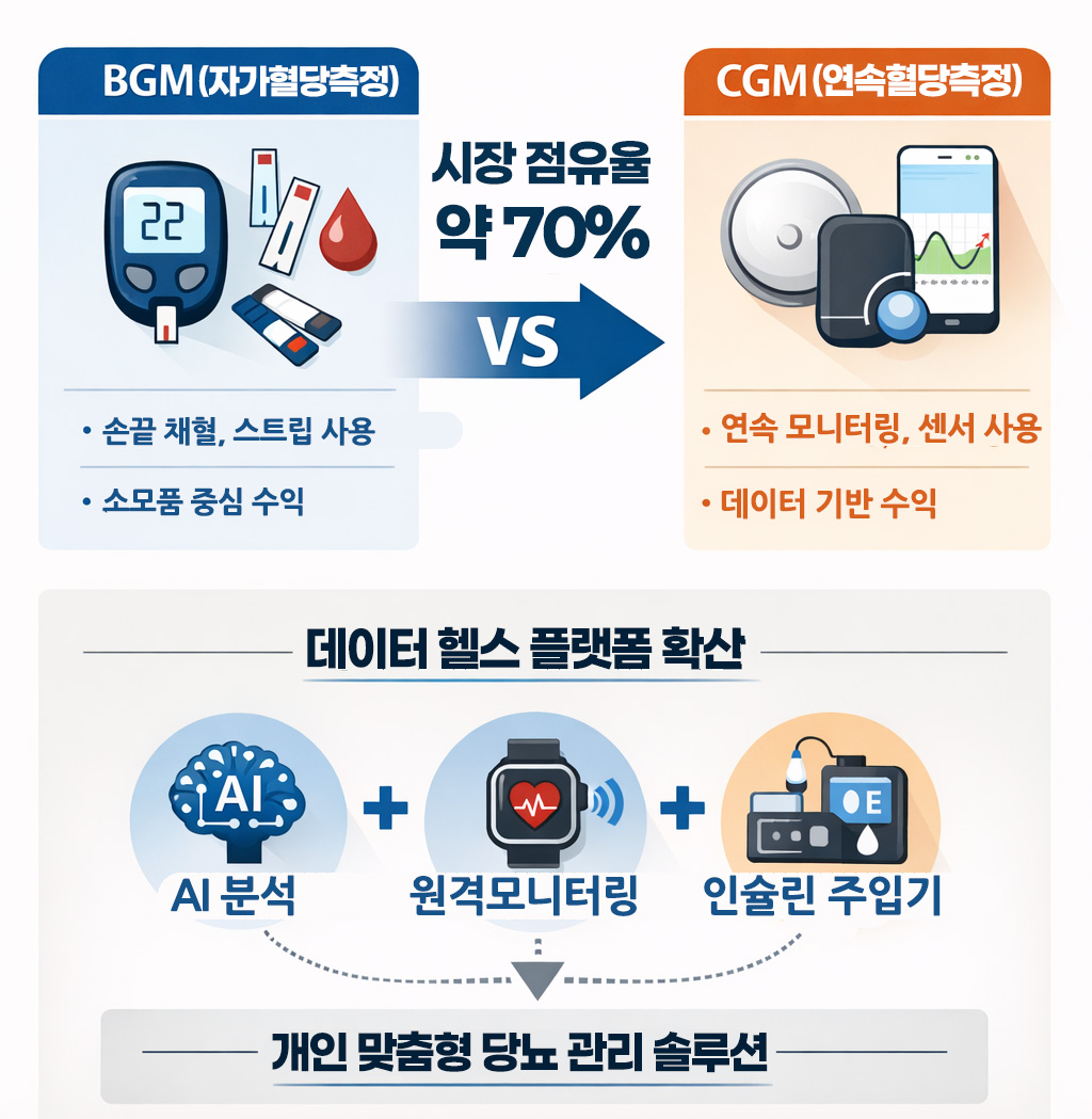 향후 당뇨 관리 시장은 '기기 시장'이 아니라 '데이터 시장'으로 재편될 가능성이 높다. 센서 자체의 마진은 점차 낮아지는 반면, 데이터 분석과 서비스에서 창출되는 부가가치는 커질 것이다. 이는 과거 BGM 시대의 '스트립 비즈니스 모델'이 CGM 시대의 '플랫폼 비즈니스 모델'로 전환되는 과정으로 볼 수 있다. 기업 간 경쟁 역시 하드웨어 스펙이 아니라 데이터 처리 능력, 알고리즘 정교도, 사용자 경험(UX)에서 갈릴 가능성이 크다.