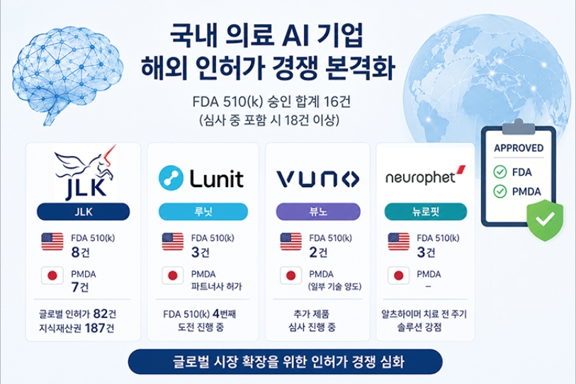 [메디칼타임즈=최선 기자] 국내 의료 AI 기업들의 해외 인허가 경쟁이 본격화되는 가운데, 제이엘케이(JLK)가 미국 FDA 510(k) 8건·일본 PMDA 7건을 포함해 글로벌 인허가 82건, 지식재산권 187건을 확보하며 국내 의료 AI 업계 최다 인허가 기업으로 올라섰다.