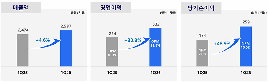 영업이익률(OPM)은 10.3%에서 12.8%로 2.5%포인트 상승했으며 당기순이익은 259억원으로 무려 48.9% 급증했다. 매출 증가 폭에 비해 이익 증가 폭이 현저히 높은 이른바 '이익 레버리지' 현상이 두드러졌다.