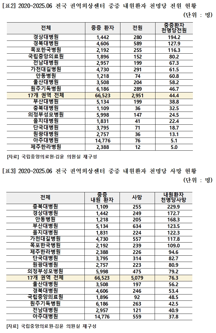 2020년부터 2025년 6월까지 전국 권역 외상센터에 내원한 환자는 총 18만 4806명으로, 전원율은 6.6%(1만 2153명), 사망률은 2.8%(5155명)였다. 이 중 중증 환자는 6만 6523명으로, 전원율 4.4%(2951명), 사망률 7.6%(5079명)를 기록했다.