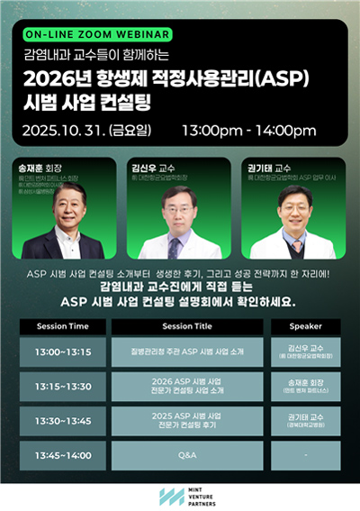 민트 벤처 파트너스(대표 : 송재훈, 전 삼성서울병원장)이 2차년도 항생제 적정사용관리(ASP) 시범사업에 참여하는 병원들을 대상으로 오는 31일(금) '2026년 항생제 적정사용관리(ASP) 시범사업 컨설팅'에 대한 웨비나를 개최한다.