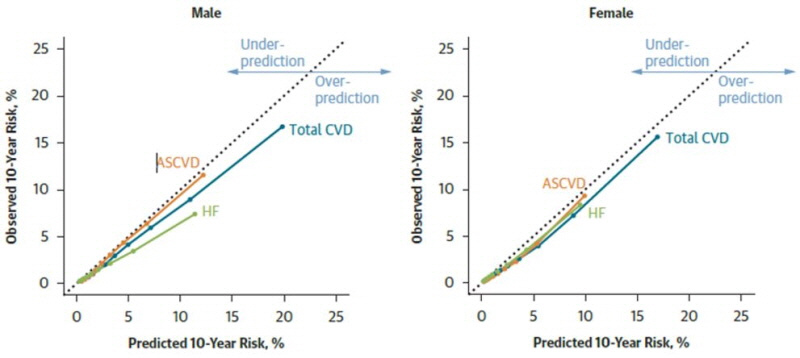 보정도에 있어서도 죽상경화성 심뇌혈관질환에 대해서는 보정 기울기가 남자 0.98, 여자 0.93으로 높은 수준을 보였으며 심부전에 대해서는 보정 기울기가 남자 0.64, 여자 0.86으로, 남자에서는 예측보다 실제 누적 발생률이 다소 낮은(과대예측) 경향을 보였다.