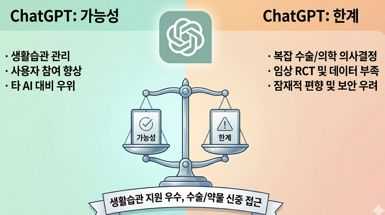 연구진은 이러한 결과를 바탕으로 ChatGPT의 성능을 '잠재력은 높지만 임상적 검증은 부족한 상태'로 해석했다. 생활습관 개선과 같은 저위험 영역에서는 비교적 유용하게 활용될 수 있지만, 수술이나 약물 처방 등 고위험 의사결정 영역에서는 신중한 접근이 필요하다는 것.