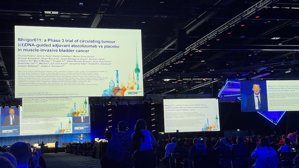 [메디칼타임즈=박상준 기자]유럽종양학회(ESMO)는 고위험 근침윤성 방광암(muscle-invasive bladder cancer, MIBC) 환자에서 ctDNA 기반 MRD 모니터링에 따른 보조요법으로서 면역항암제 아테졸리주맙과 위약을 비교한 3상 연구를 발표했다.[ESMO 2025=독일 베를린]암치료에서 ctDNA(순환종양DNA) 기반 미세잔존질환(molecular residual disease, MRD) 검사의 유용성이 입증됐다. 유럽종양학회(ESMO)는 고위험 근침윤성 방광암(muscle-invasive bladder cancer, MIBC) 환자에서 ctDNA 기반 MRD 모니터링에 따른 보조요법으로서 면역항암제 아테졸리주맙과 위약을 비교한 3상 연구를 20일 전격 발표했다.그동안 MIBC 환자에서 ctDNA 기반 MRD 모니터링은 보조요법의 필요성을 구분하는 유망한 접근으로 평가되어 왔는데, 이번에 공개된 IMvigor011은 실제로 ctDNA 양성 환자에게 아테졸리주맙(atezo)을 투여했을 때 효과를 평가한 첫 ctDNA-guided phase 3 임상시험이다.연구는 ctDNA 모니터링을 수술 후 1년 동안 정기적으로 실시했고, 이후 양성인 환자를 2:1로 배정해 각각 아테졸리주맙과 위약을 투여하고, 1차 평가변수로 무질병 생존기간(DFS)을 관찰했다. 2차 평가변수는 전체 생존기간(OS)으로 설정했다.그결과 아테졸리주맙군의 DFS는 각각 9.9개월로 위약군(4.8개월)대비 통계적으로 의미있게 높았다(HR 0.64 (0.47–0.87); p=0.0047). 또한 OS 분석에서도 각각 32.8개월과 21.1개월(위약군)보다 통계적으로 의미있는 차이를 보였다(HR 0.59 (0.39–0.90); p=0.0131). IMvigor011 연구 결과Grade 3–4 이상 이상반응은 각각 28.5%, 21.7%, 치료 관련 중증 이상반응은 각각 7.3%, 3.6%였다. 치료 관련 사망률은 1.8%, 0%로, 새로운 안전성 이슈는 보고되지 않았다.토마스 파울스(Thomas B. Powles) 영국 퀸즈메리 대학( Queen Mary University of London) 교수는 “ctDNA 양성 환자에서 아테졸리주맙이 DFS·OS 모두 개선했다는 점에서 새로운 표준 가능성이 있고, 반대로 ctDNA 음성 환자는 면역항암제 치료 없이도 재발률 낮음을 보여줌으로서 치료 최소화가 가능해졌다”고 평가했다.나아가 "이번 연구는 ctDNA-guided 면역항암제 보조치료가 근침윤성 방광암에서 임상적 효용성을 입증한 첫 대규모 무작위 3상 임상시험으로,향후 치료가 필요한 환자만 정밀하게 선별하는 새로운 패러다임의 근거로 평가될 수 있을 것이다"라고 총평했다.토론자로 나선 알렉산더 와이엇(Alexander W. Wyatt) 캐나다 브리티시 컬럼비아의대(University of British Columbia) 교수는 "이번 결과는 ctDNA를 활용한 개인 맞춤 치료 전략을 실험적으로 적용한 초기 사례 중 하나로서 향후 암 연구 전체에 적용될 수 있다고 본다"며 "결과적으로, 새로운 패러다임을 만들고 목표로 하는 치료 효과와 반응을 정확히 평가하는데 목적이 있다”고 말했다.아테졸리주맙을 개발한 로슈. ESMO 2025에 참석해 파이프라인을 공개했다.