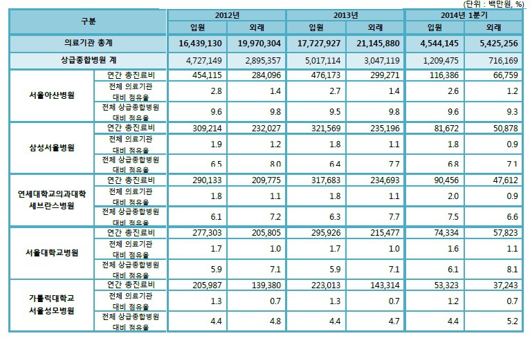 이 중 빅5병원의 2014년 1분기 총 입원 진료비는 4161억원으로 전체 의료기관 대비 9.2%, 전체 상급종합병원 대비 34.4%의 입원 진료비 점유율을 기록했다.