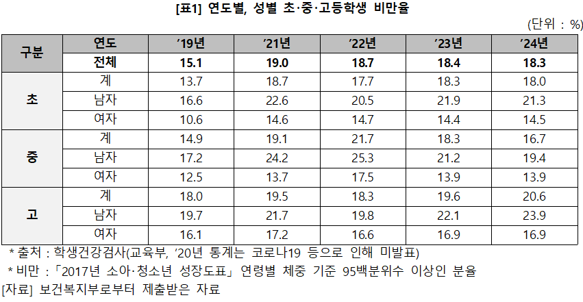 2일 더불어민주당 박희승 의원실은 보건복지부로부터 제출받은 초·중·고등학생의 비만율 자료를 공개했다. 그 결과 이들 연령대 비만율이 2019년 15.1%에서 지난해 18.3%로 높아졌다.